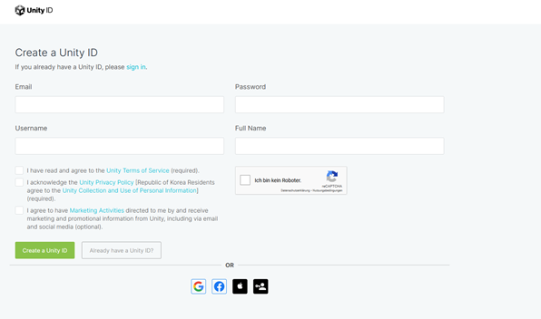 - Klicken Sie auf „Create a Unity ID“, um fortzufahren.