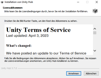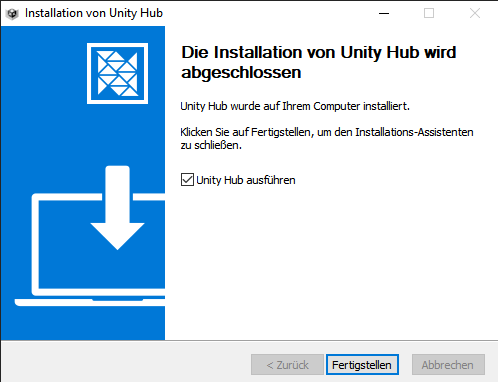 - Nach Abschluss der Installation klicken Sie auf „Fertigstellen“. Wenn der Haken „Unity Hub ausführen“ gesetzt ist, wird das Programm geöffnet.
